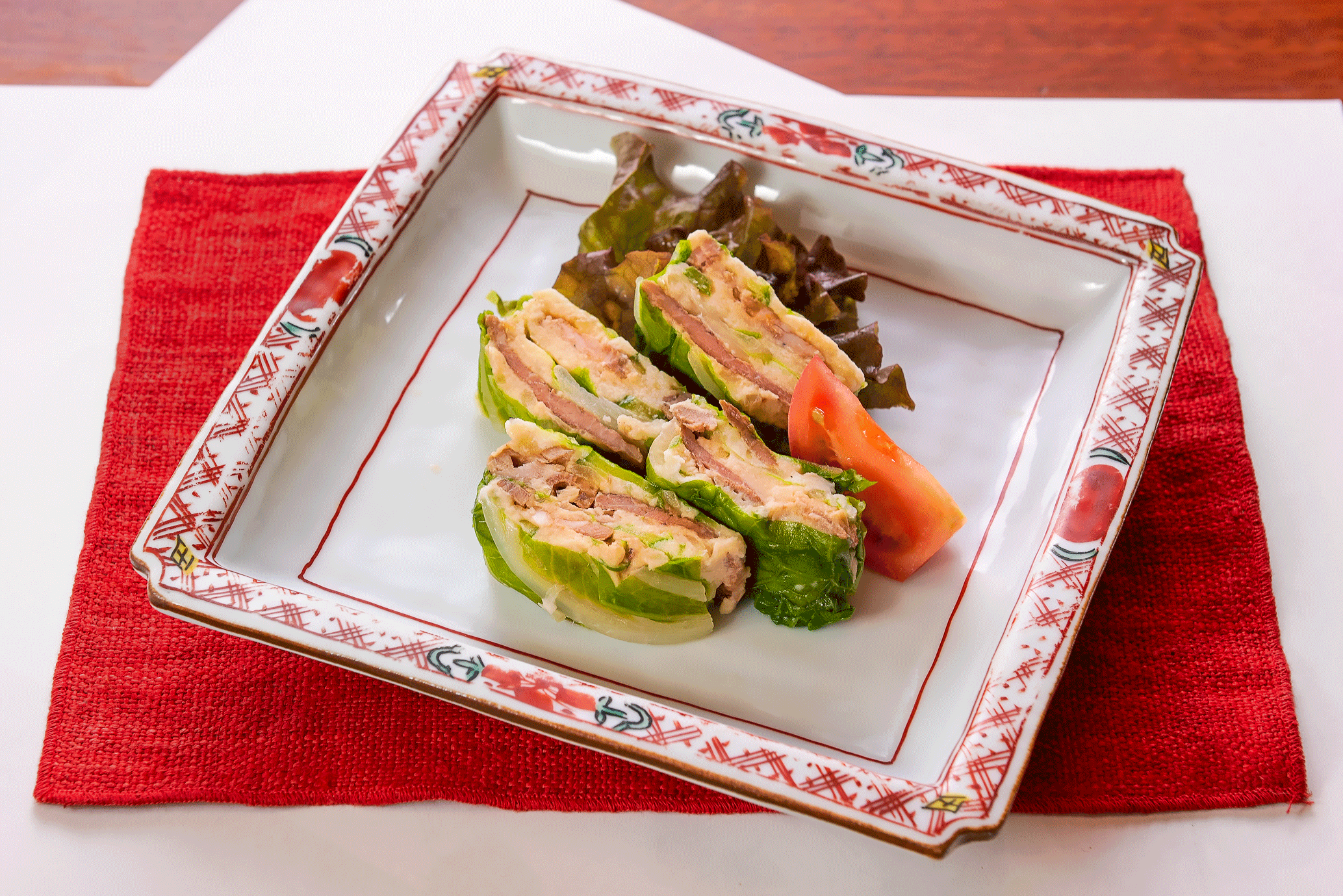 白菜と餅豚スライスとポテサラを重ねて層を作りミルフィーユにみたてました。冷めても美味しい焼き物です。