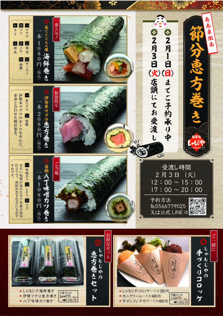 節分は、しゃもじやの恵方巻きで福を呼び込みましょう。